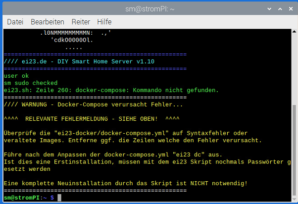 Ok, dann hatte deine Installation doch Lücken, denn docker-compose wurde (u.a.) nicht installiert. Vermutlich wegen der instabilen Netzwerkverbindung.
